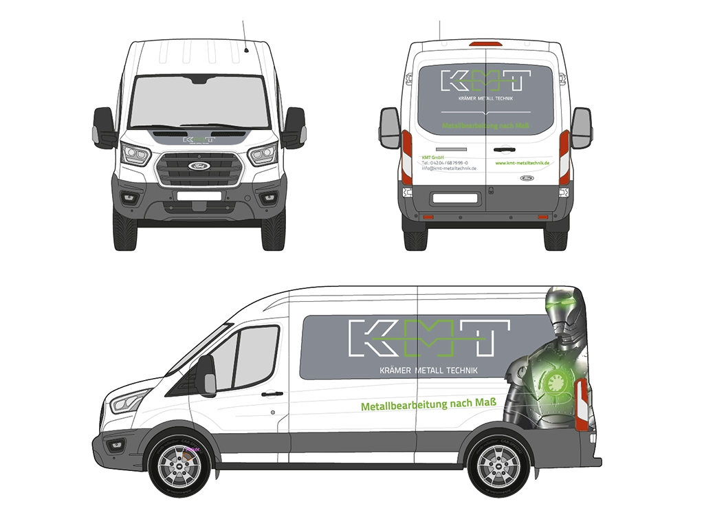 - Sichtbarkeit & Team: Umsetzung der Fahrzeugbeschriftung sowie Gestaltung und der Arbeitskleidung für ein einheitliches Auftreten beim Kunden.