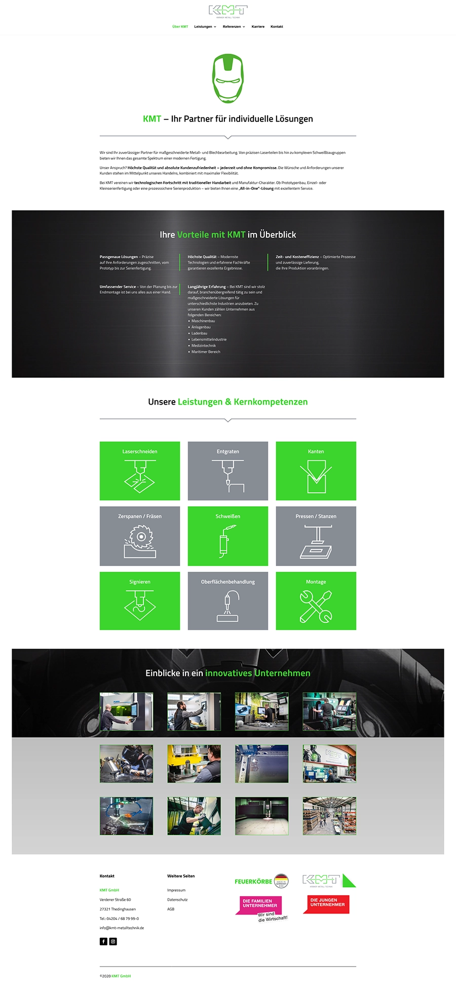 - Umfangreiche Leistungsübersicht: Detaillierte Darstellung der Fertigungsverfahren wie Kanten, Schweißen und Zerspanen, um die hohe Fertigungstiefe von KMT zu unterstreichen.