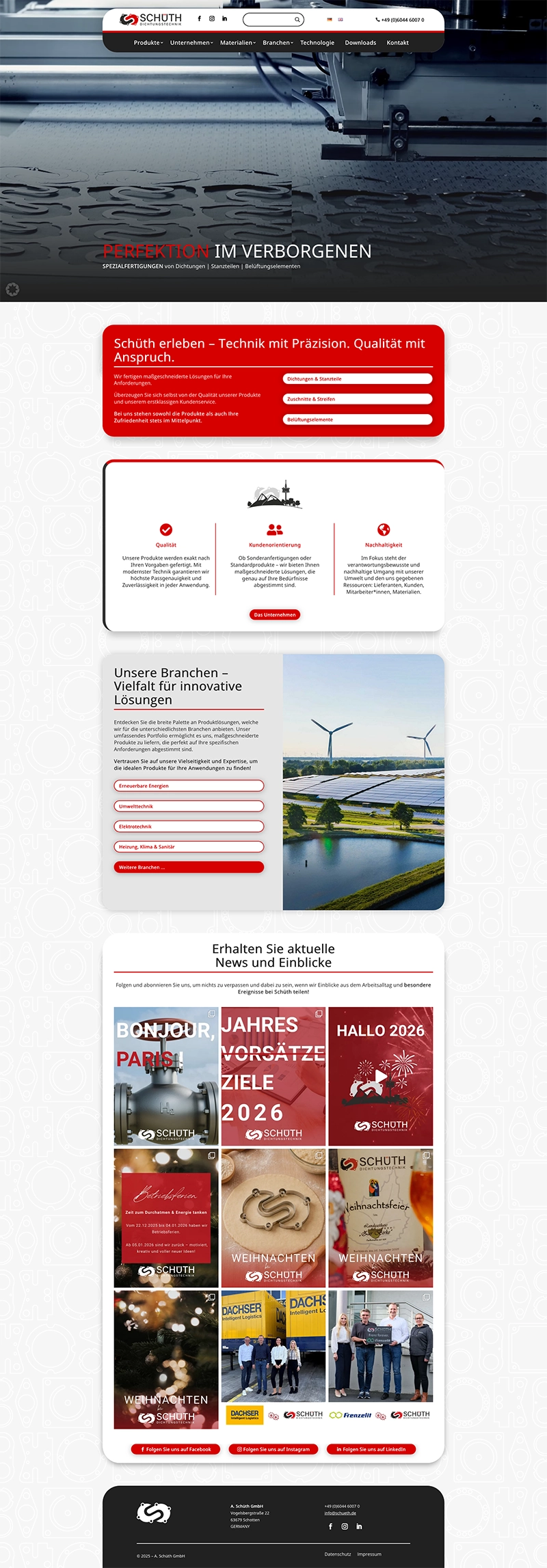 Für die A. Schüth GmbH haben wir eine digitale Plattform geschaffen, die technisches Handwerk und industrielle Perfektion erlebbar macht. Als Spezialist für Dichtungstechnik und Stanzteile benötigt Schüth einen Internetauftritt, der sowohl die enorme Materialvielfalt als auch die branchenspezifische Expertise klar strukturiert abbildet.